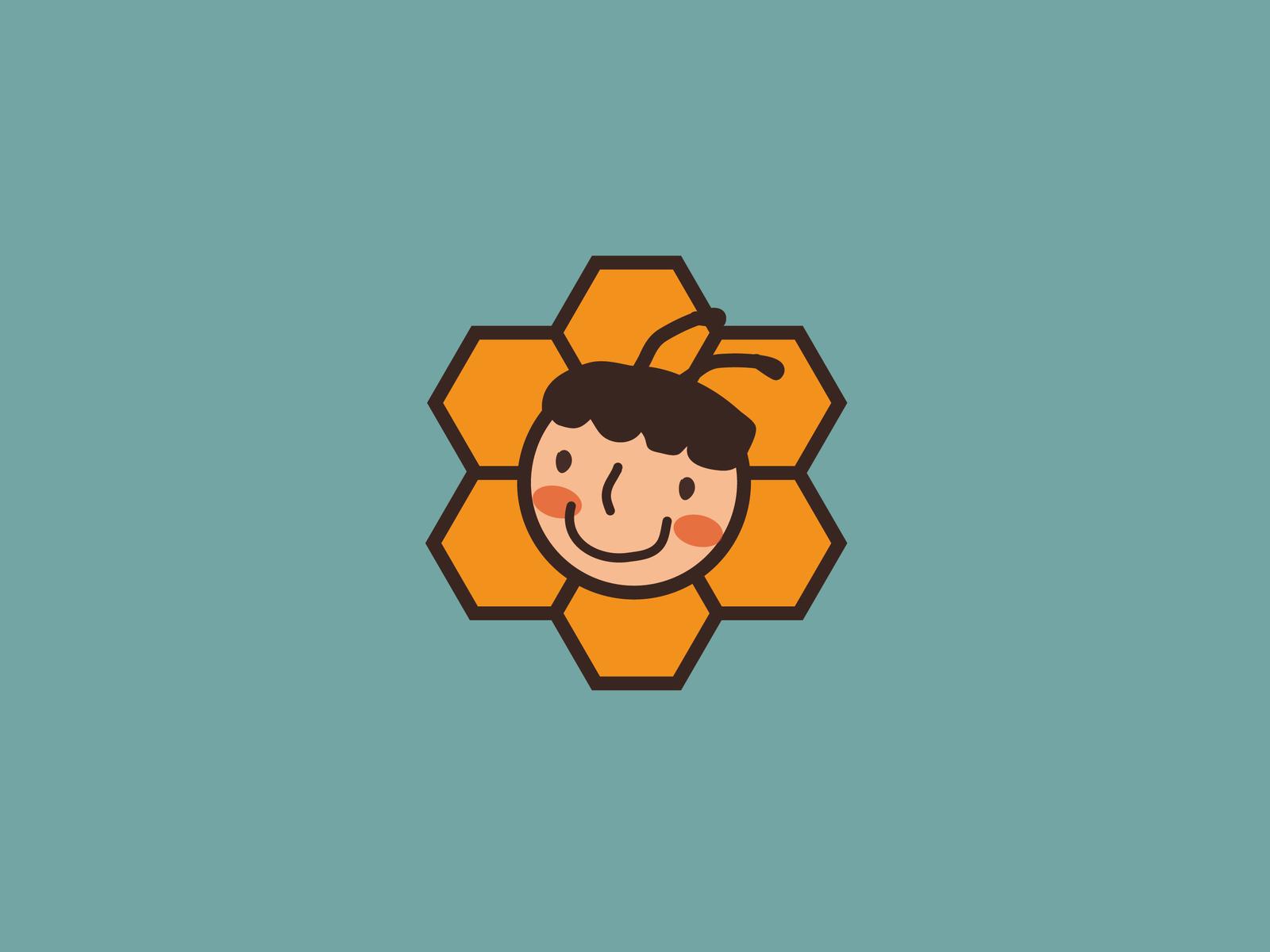 以童趣的蜜蜂頭像呈現,背景為蜂巢的六邊形結構,代表著書庫與知識,象徵書城為智慧和學習的來源。