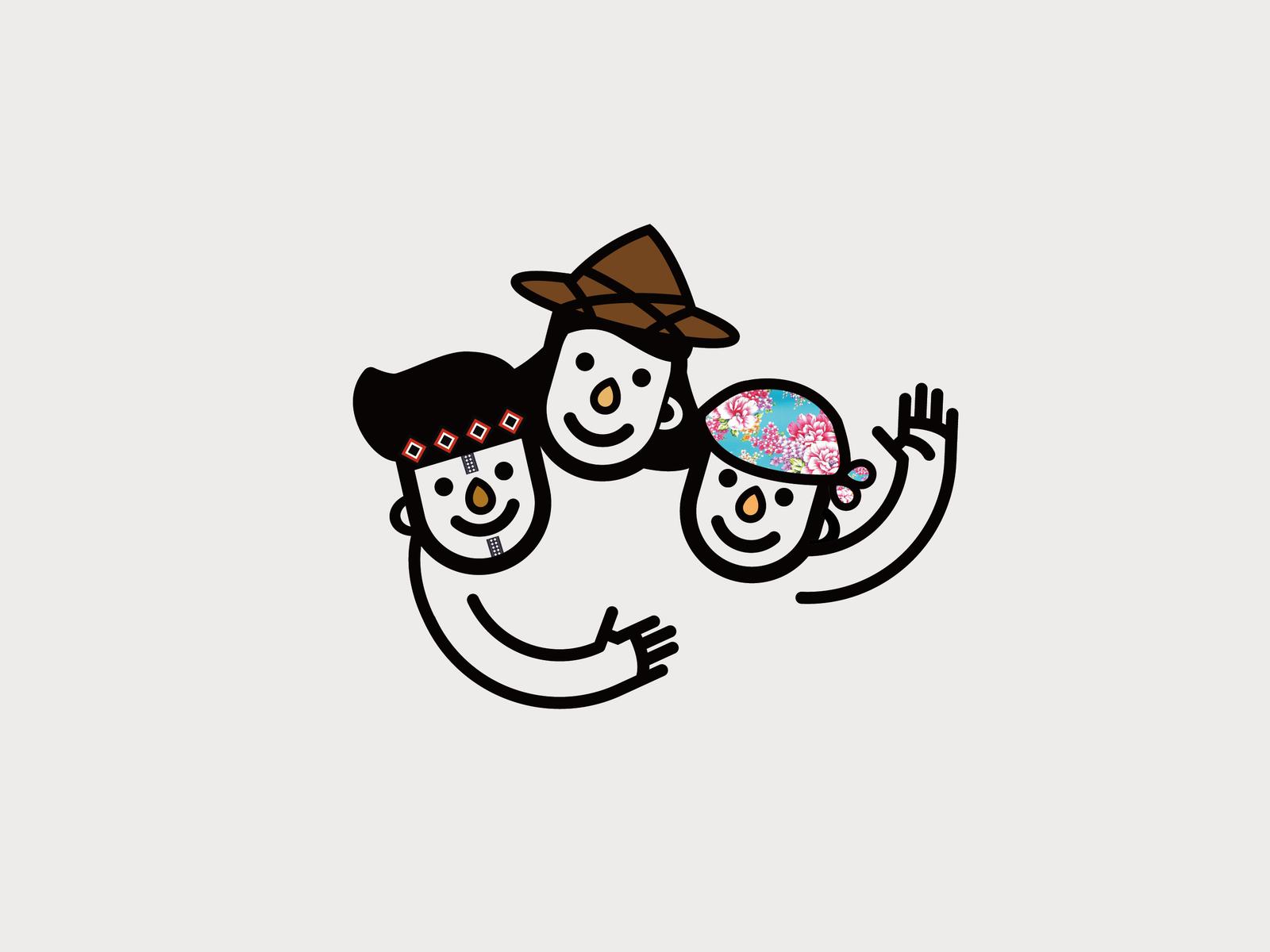 以簡約線條與象徵性頭飾,刻畫三位不同文化背景的人物,以微笑擁抱的姿勢,傳遞友善、多元與包容精神。